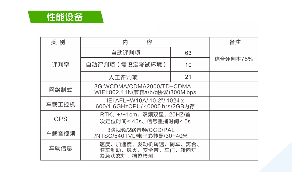 擁有功能強(qiáng)大的數(shù)據(jù)處理單元——高性能工控機(jī),高精度車(chē)輛信號(hào)采集設(shè)備,集成高精度高動(dòng)態(tài)的衛(wèi)星差分定位系統(tǒng),以及以微機(jī)電陀螺儀為核心的慣性導(dǎo)航單元。從而實(shí)現(xiàn)了對(duì)考試評(píng)判項(xiàng)目進(jìn)行準(zhǔn)確的自動(dòng)化評(píng)判。同時(shí),本系統(tǒng)還具備友好的人機(jī)交互界面,和方便實(shí)用的車(chē)載控制器。